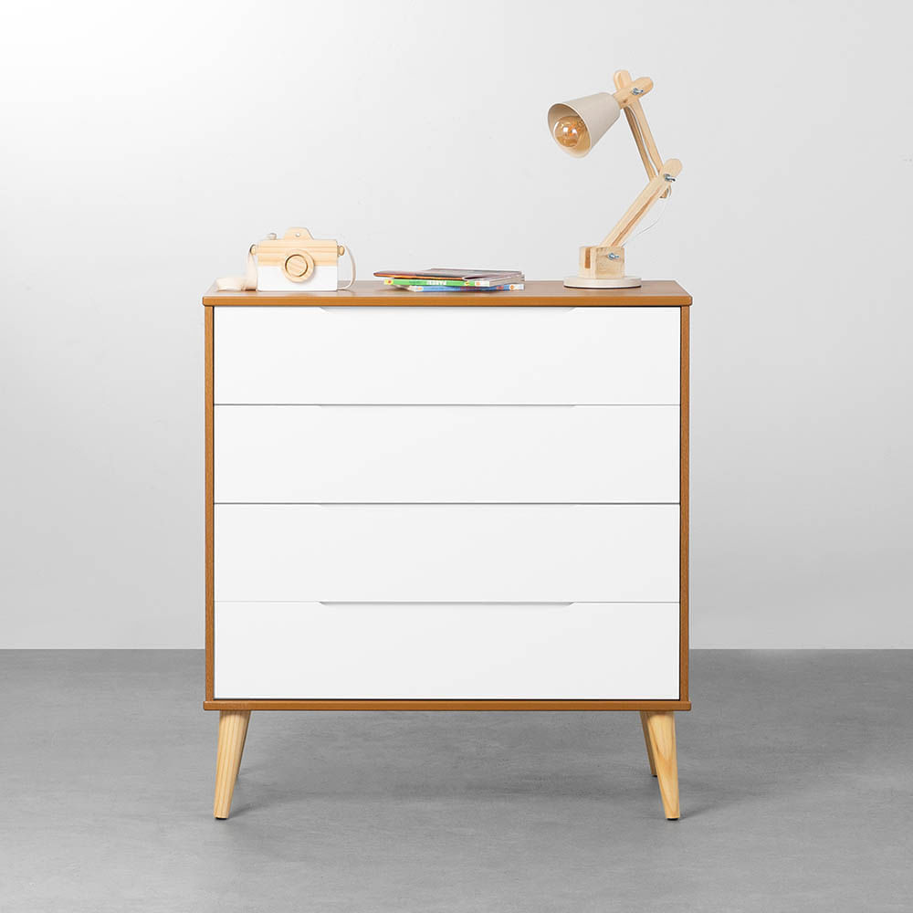 Cômoda Elfe 4 Gavetas com Pés Retrô Natural - Branco Fosco e Savana |