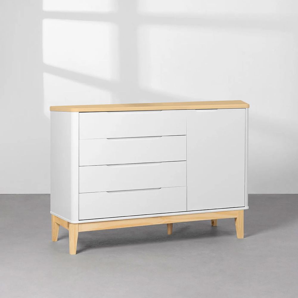 A Cômoda Boom 4 Gavetas e 1 Porta com Pés Natural - Branco Fosco e Savana é uma peça que une praticidade e charme ao ambiente infantil. Seu design vintage e acabamento fosco proporcionam um toque aconchegante e elegante ao quarto do bebê. Além disso, oferece amplo espaço para organização com quatro gavetas e uma porta, garantindo conforto e facilidade no dia a dia.