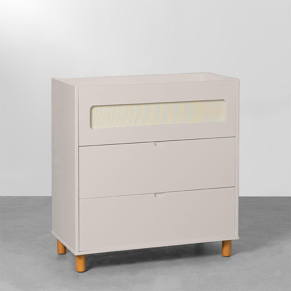 A Cômoda Ollie 3 Gavetas com Pés Natural - Areia Fosco é uma peça que une praticidade e aconchego para o quarto infantil. Com um design moderno e elegante, oferece conforto no uso diário e facilidade na organização dos pertences. Seu acabamento fosco e os pés em madeira garantem um toque acolhedor e durável ao ambiente.