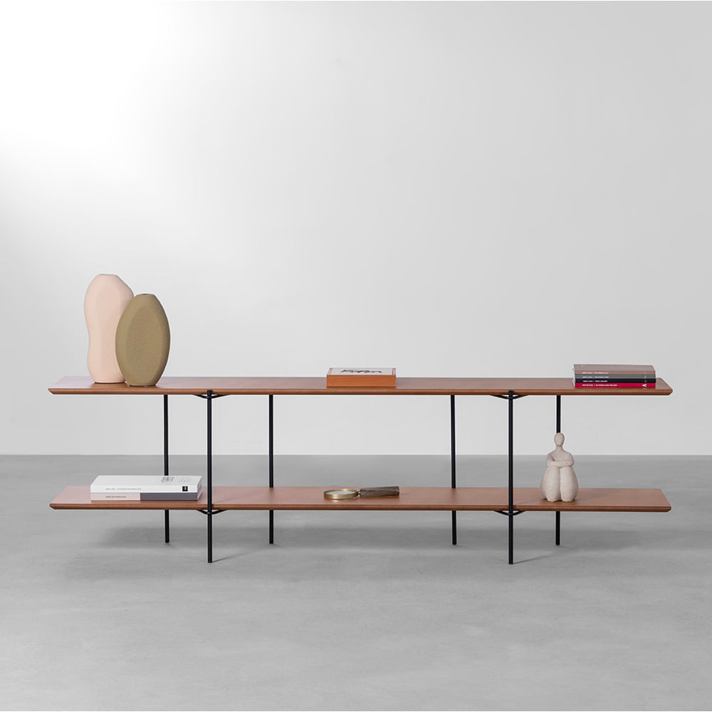 Este produto é especial por combinar madeira preta com tampo Tammi, criando um visual moderno e rústico ao mesmo tempo. Sua estrutura com compartimentos abertos e fechados facilita a organização, tornando-o ideal para diversos ambientes como salas e escritórios.
