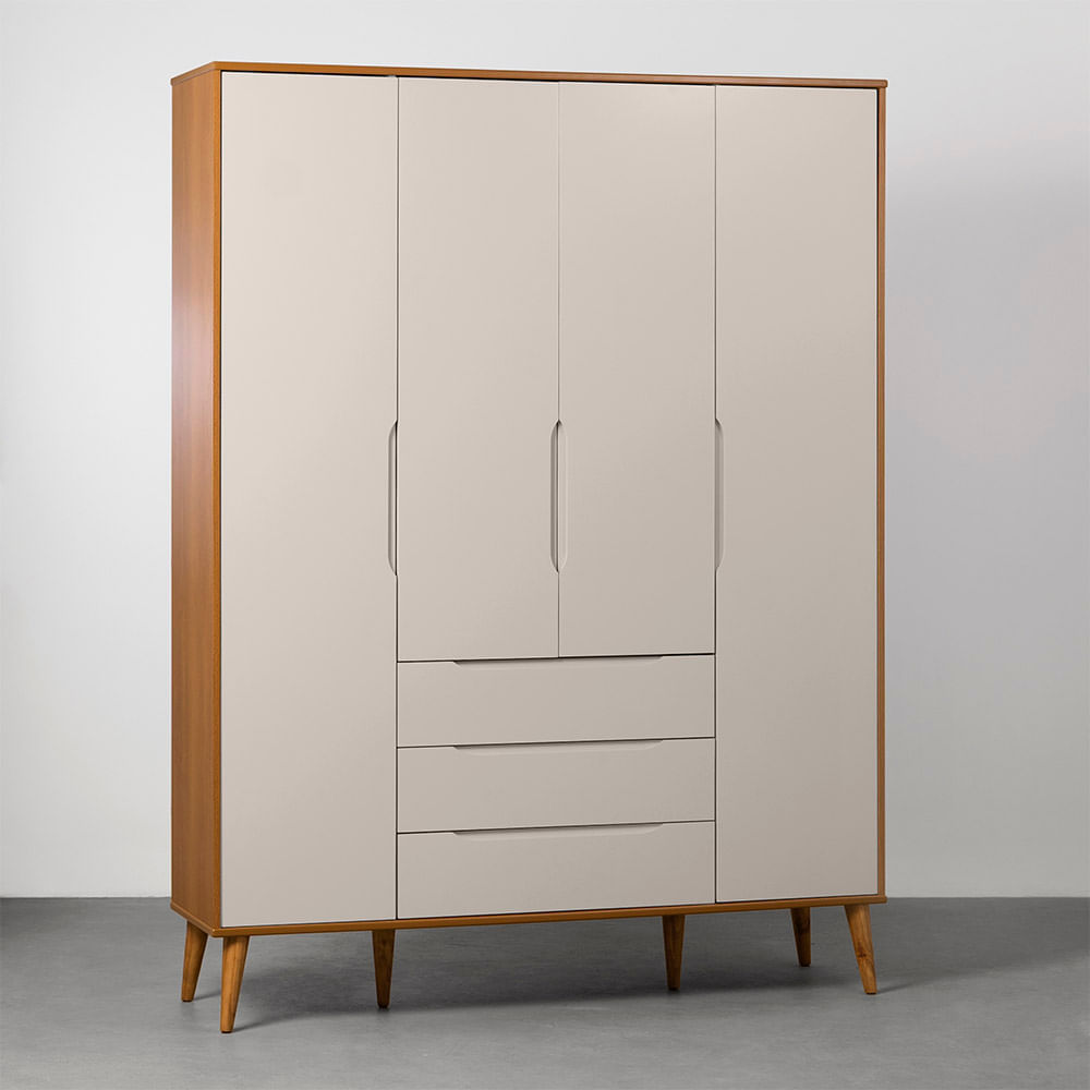 O Guarda-Roupa Elfe 4 Portas e 3 Gavetas com Pés Retrô Mel – Areia Fosco e Savana é um móvel que combina charme e funcionalidade para o quarto infantil. Seu design com pés retrô em madeira natural e puxadores embutidos proporciona um toque acolhedor e elegante. Além disso, oferece amplo espaço interno com divisórias e cabideiro metálico para facilitar a organização. É perfeito para quem busca conforto e praticidade em um ambiente aconchegante.