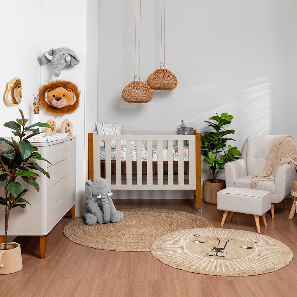 O Berço Tom é um móvel versátil que se adapta ao desenvolvimento do bebê, podendo ser usado como mini berço, berço padrão americano e mini cama. Seu design com pés retrô e acabamento em cor areia proporciona harmonia visual ao quarto, combinando estilo e funcionalidade.