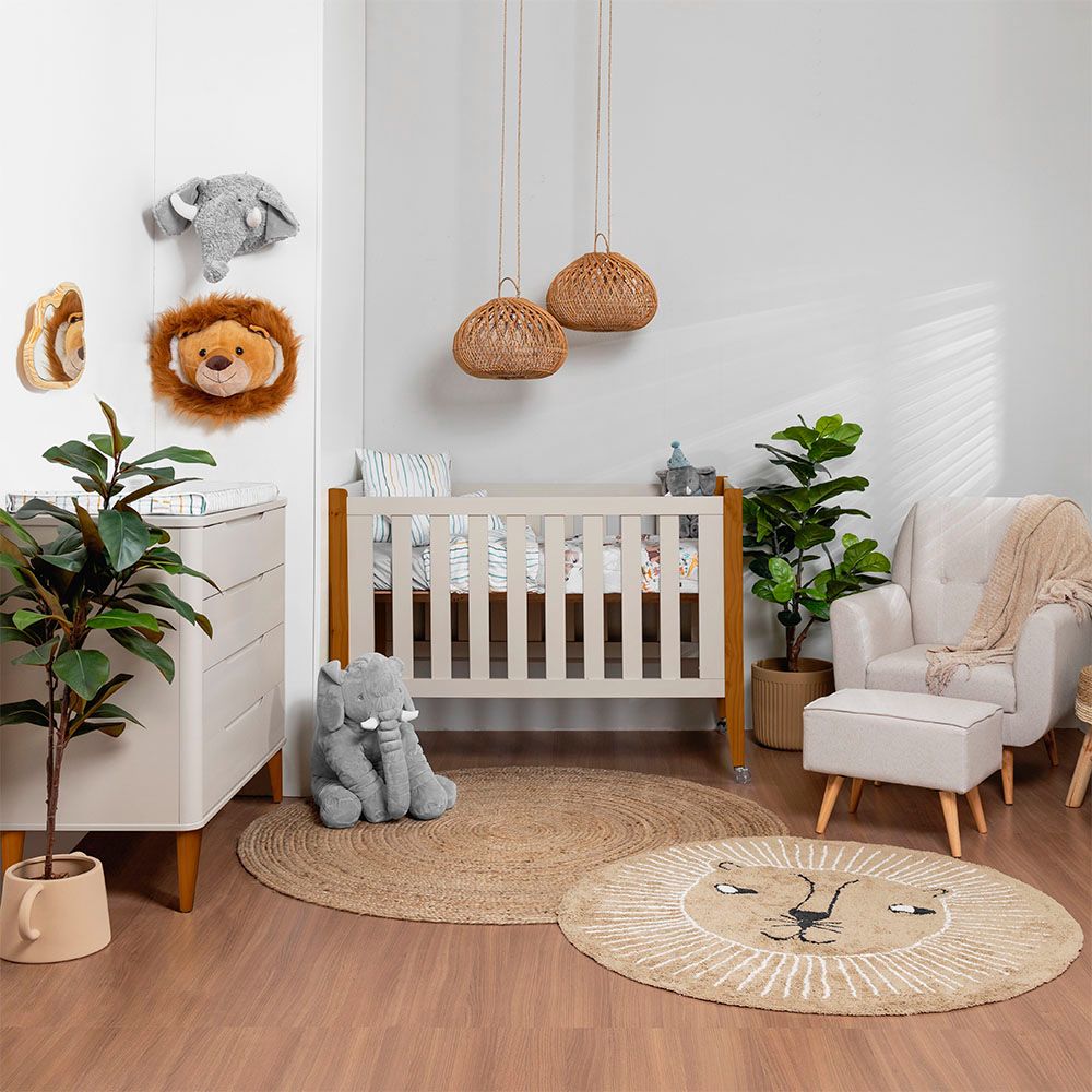 O Berço Tom destaca-se pela sua versatilidade e design retrô com pés em madeira, proporcionando uma estética acolhedora ao quarto. Seu acabamento em MDF com cantos arredondados garante segurança e harmonia visual, adaptando-se ao ambiente com elegância.