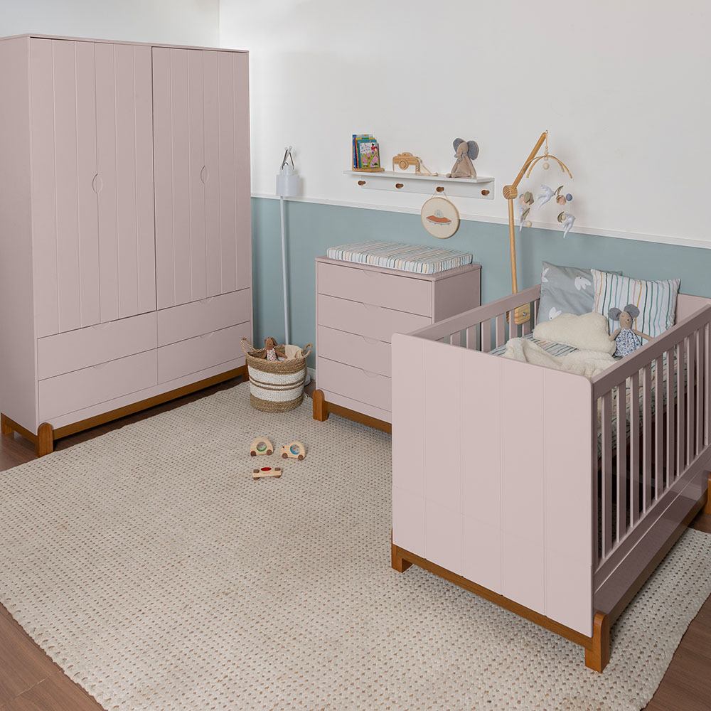 Kit Quarto Infantil Lotus Berço Mini Cama com Frisos + Cômoda 4 Gavetas + Guarda-Roupa 4 Portas com 4 Gavetas - Rosa Fosco |