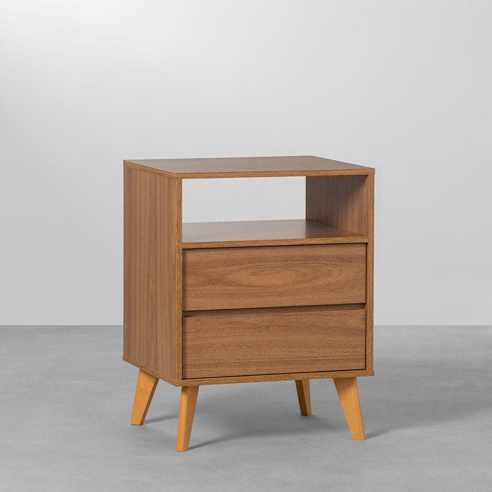 • 2 gavetas com corrediças telescópicas para abertura suave e eficiente; • 1 nicho aberto, ideal para objetos de uso diário; • Acabamento em MDP BP de 15 mm no padrão Louro Freijó; • Pés em madeira natural com design escandinavo; • Compacta e funcional, perfeita para espaços reduzidos.